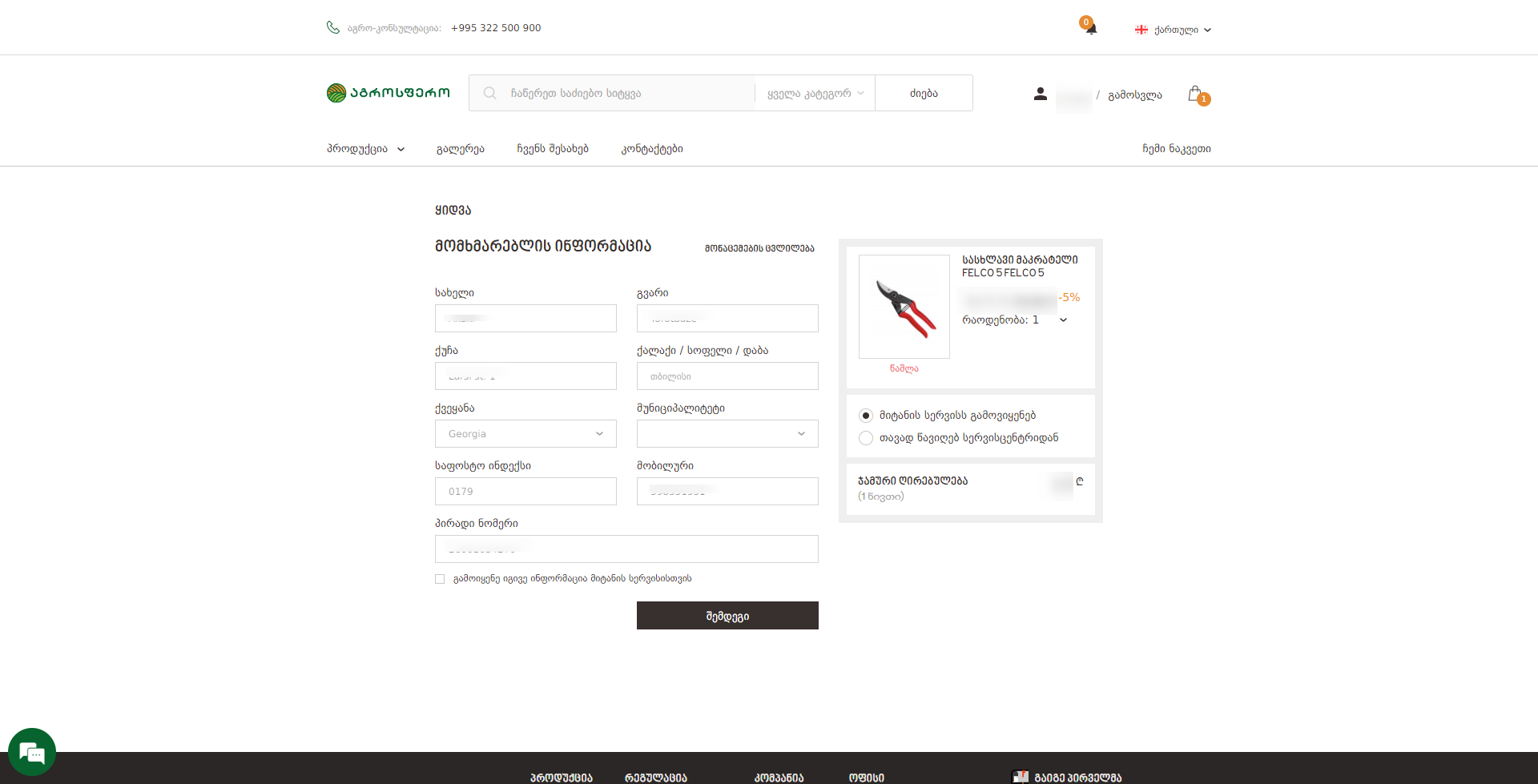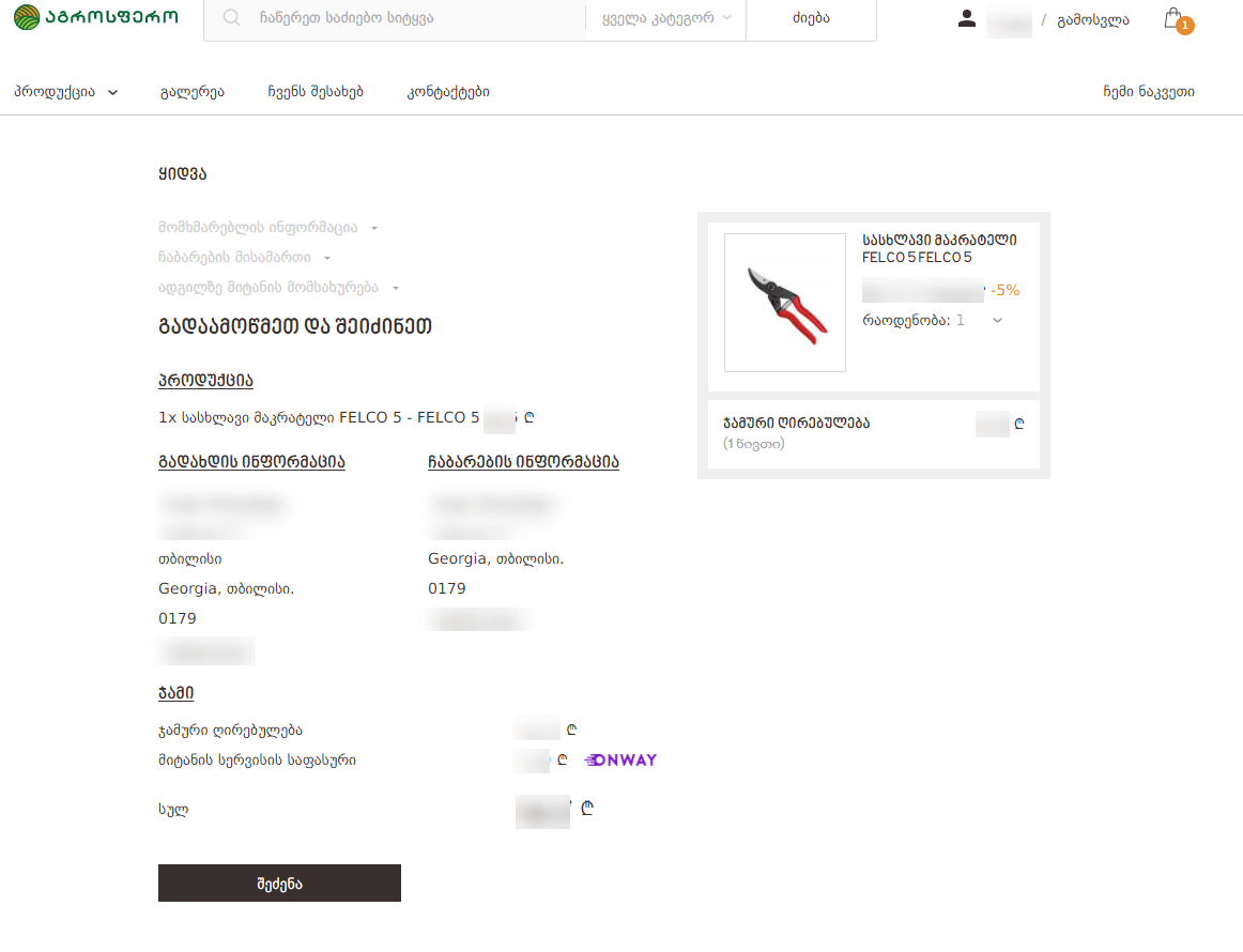 გადახდამდე კიდევ ერთხელ გადაამოწმეთ სრული ინფორმაციის სიზუსტე, მომხმარებლის პირადი მონაცემების, ჩაბარების მისამართის, პროდუქციის რაოდენობისა, ფასის, ფასდაკლებისა და მიტანის სერვისის ღირებულების ჩათვლით. მას შემდეგ როცა დარწმუნდებით ინფორმაციის სიზუსტეში დააჭირეთ ღილაკს "შეძენა"