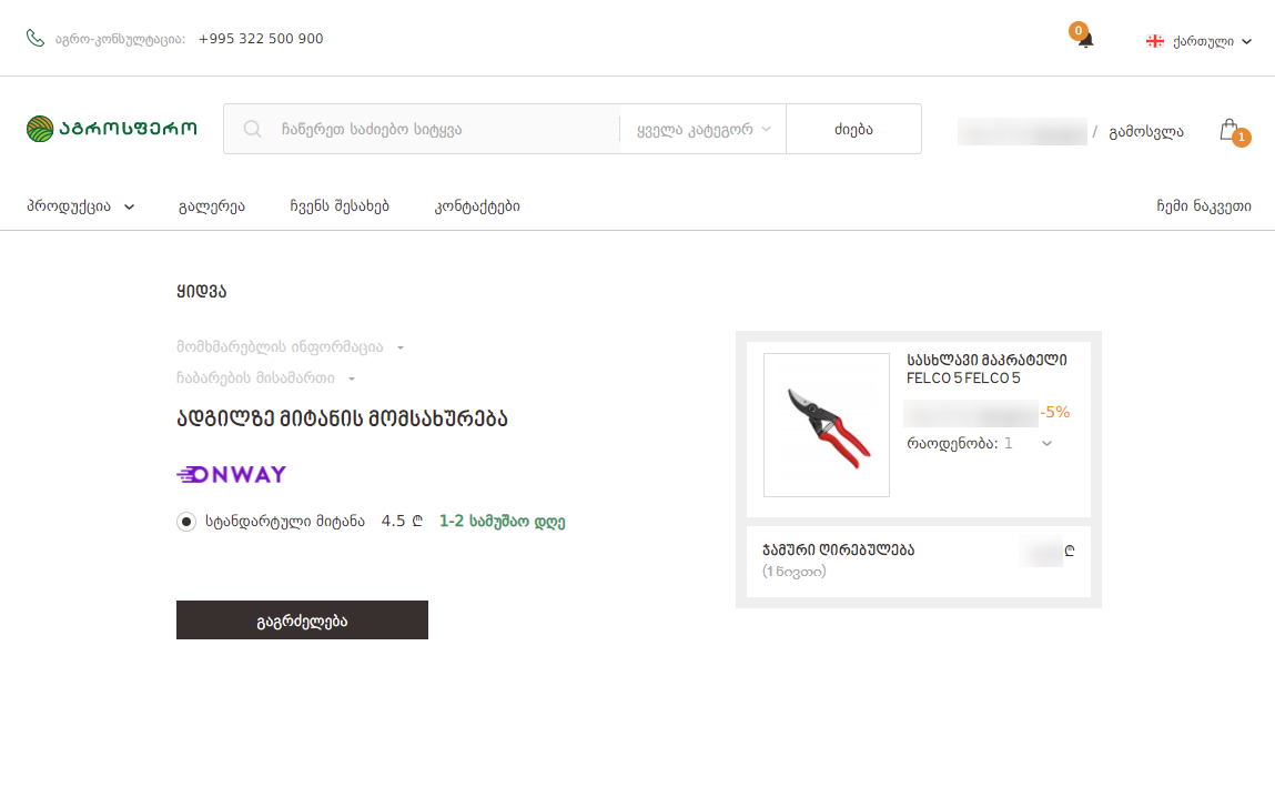 მომდევნო გვერდზე თქვენ იხილავთ ადგილზე მიტანის მომსახურების სერვისის საფასურს და მიტანის ვადას, კვლავ დააჭირეთ ღილაკს "გაგრძელება"