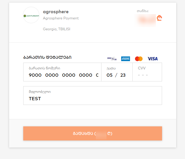 თქვენ გადამისამართდებით გადახდის გვერდზე, სადაც შეგიძლიათ გადაიხადოთ ნებისმიერი ბანკის VISA, MASTERCARD ან AMEX ბარათით. გადახდის გვერდზე შეიყვანეთ ბარათის 16-ნიშნა ნომერი, ვადა რომელიც მითითებულია ბარათის წინა მხარეს,ბარათის მფლობელის სახელი და გვარი, ასევე CVV კოდი, რომელიც ბარათის უკანა მხარეს განთავსებული ციფრებიდან ბოლო 3 ციფრია. მონაცემების შევსების შემდეგ დააჭირეთ "გადახდა".
