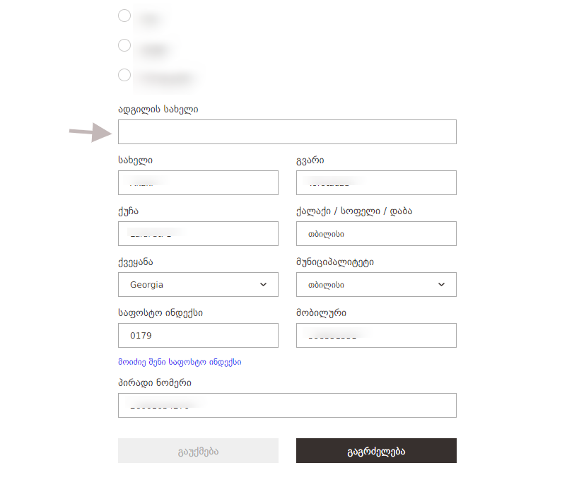 მომდევნო გვერდზე დაკოპირდება იგივე ინფორმაცია და შესავსები იქნება მხოლოდ პირველი ველი "ადგილის სახელი", სადაც შეგიძლიათ ჩაწეროთ ნებისმიერი მანიშნებელი სიტყვა თქვენ მიერ მითითებული მისამართის შესახებ, მაგალითად: "სახლის მისამართი", "ყვარლის ვენახები", "სამსახურის მისამართი" და ა.შ. ამ ველის შევსების შემდეგ დააჭირეთ ღილაკს "გაგრძელება"
