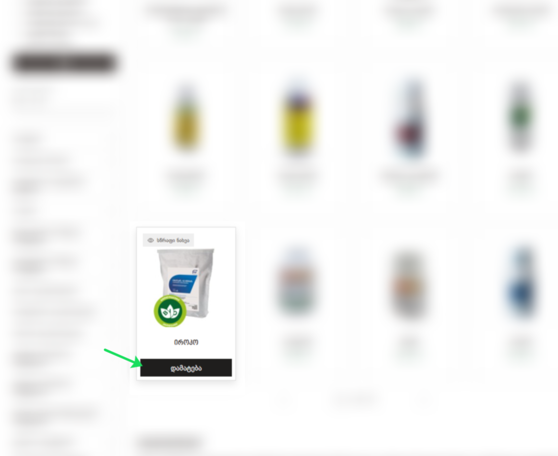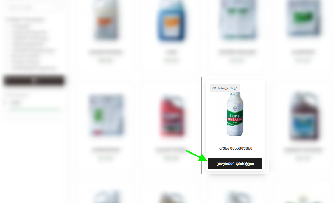 agrosphere.ge-ზე შერჩეული პროდუქტების კალათში მოთავსება შეგიძლიათ, როგორც მთავარი, პროდუქტების კატალოგის გვერდიდან, ასევე თავად პროდუქტის შიდა, აღწერის გვერდიდან. კალათში მოსათავსებლად უნდა დააჭიროთ ღილაკს "კალათში დამატება".