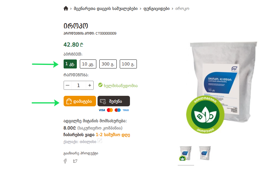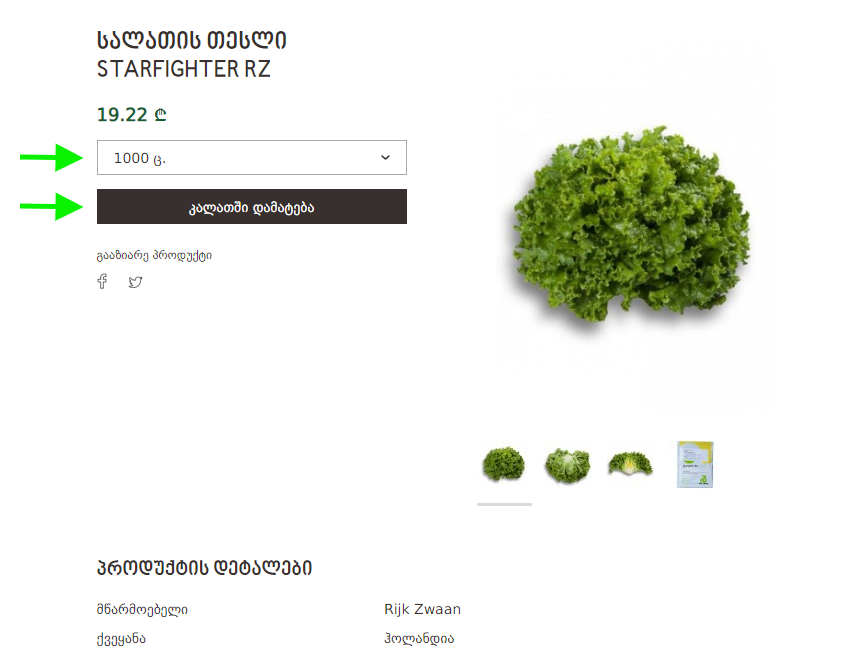 პროდუქტის შიდა გვერდიდან კალათში დამატებისას შეგიძლიათ აირჩიოთ შეფუთვის სასურველი მოცულობა ან კონკრეტული პროდუქტი ნაკრებიდან: